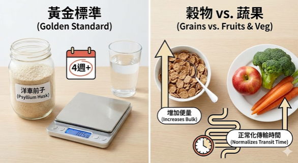 1. 初階便秘者(多數人): 優先選擇洋車前子 (Psyllium) 或非發酵性穀物纖維(如麥麩)。確保每日纖維攝取量超過 10 克,並持續補充一個月以上。這能有效增加糞便體積並軟化糞便。