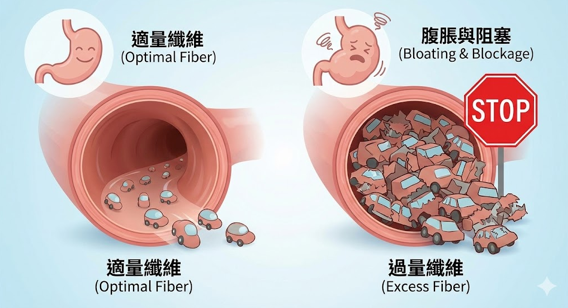 (The Traffic Jam Analogy): 該研究的作者用了一個非常生動的比喻:便秘就像是隧道裡塞滿了車(糞便)。如果隧道前面已經堵住了,這時再讓更多的車(纖維)開進隧道,只會讓交通堵塞更嚴重,甚至引發事故。